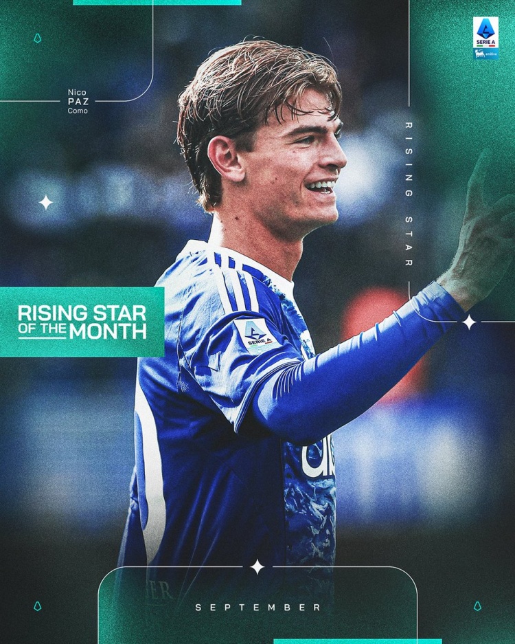 10月8日讯 意甲定约官方晓谕,科莫中场帕斯当选9月份最好新星奖。