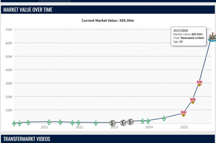 10月17日讯 德国转会商场网更新英超球员身价,纽卡斯尔新援沃尔特马德身价暴涨3500万欧,升至6500万欧元!