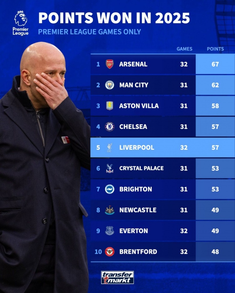11月25日讯 德国转会阛阓统计了2025年英超各队拿到的积分,并排出榜单,阿森纳67分居首,曼城62分次席,利物浦57分第五。