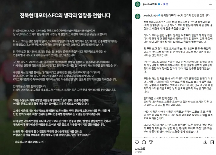 11月25日讯 此前全北当代阿根廷助教拉眼角,被韩国裁判协会禁赛5场,本日全北当代官方发布公告,示意对这一效果深表缺憾,并将提议上诉,同期助教文书离职,将在赛季纵容离队。