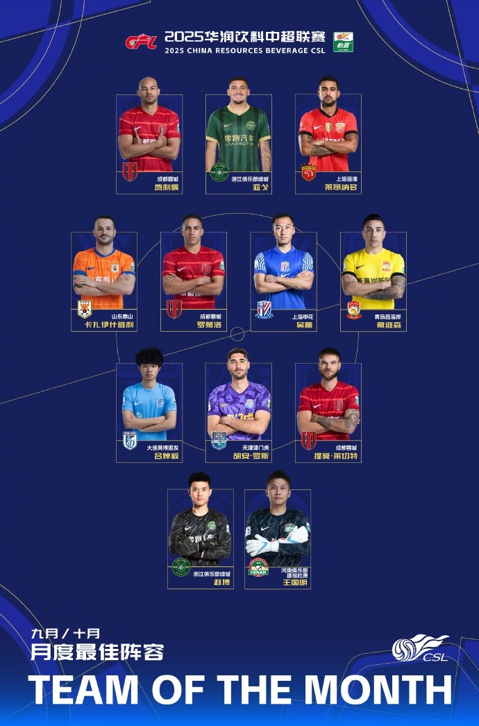 11月27日讯 中超官方公布9/10月最好威望,本次最好威望领受343阵型,蓉城三东谈主在列,门将位置有两名球员。