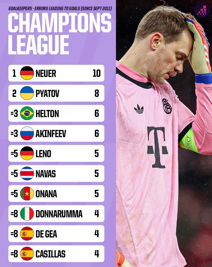 11月27日讯 在本轮欧冠,阿森纳3-1打败拜仁,诺伊尔出击造作导致丢球。数据网站OPTA也盘货了自2011年9月以来欧冠赛场门将因造作导致丢球榜单,具体如下: