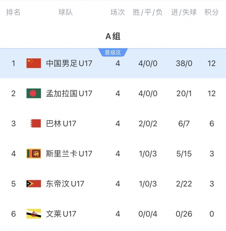 中国和孟加拉国前4轮均全胜,中国有38个净胜球,孟加拉国19个净胜球。两队今晚径直交手,左证出线端正,预选赛唯有小组第一能晋级来岁的U17亚洲杯。同分情况下优先比拟相互战绩、相互净胜球、相互进球数、小组净胜球、小组总进球数。