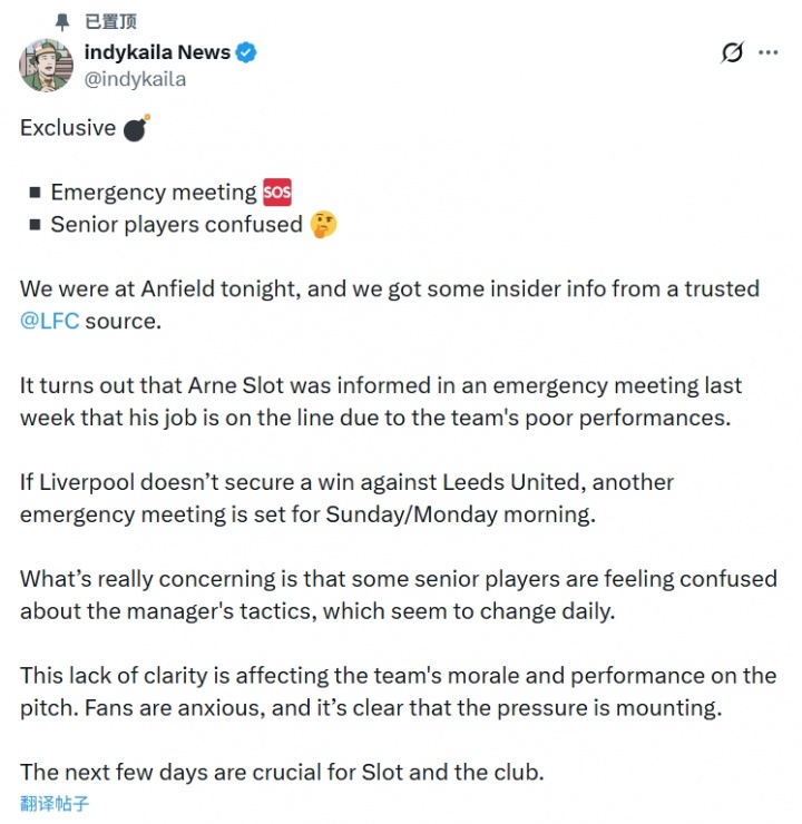 绿帽哥暗示,他们从可靠的利物浦音尘东说念主士那处赢得了一些里面音尘。斯洛特在上周的一次遑急会议上被见告,由于球队发扬欠安,他的帅位岌岌可危。
