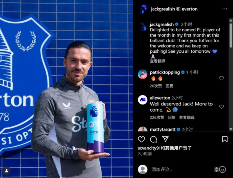 球员更新社媒,晒最先捧最好球员奖杯相片,并写谈:特地欣喜能在加盟这家出色的俱乐部首月就被评为英超月最好球员!感谢埃弗顿的接待,咱们会不绝尽力!未来见💙🙏