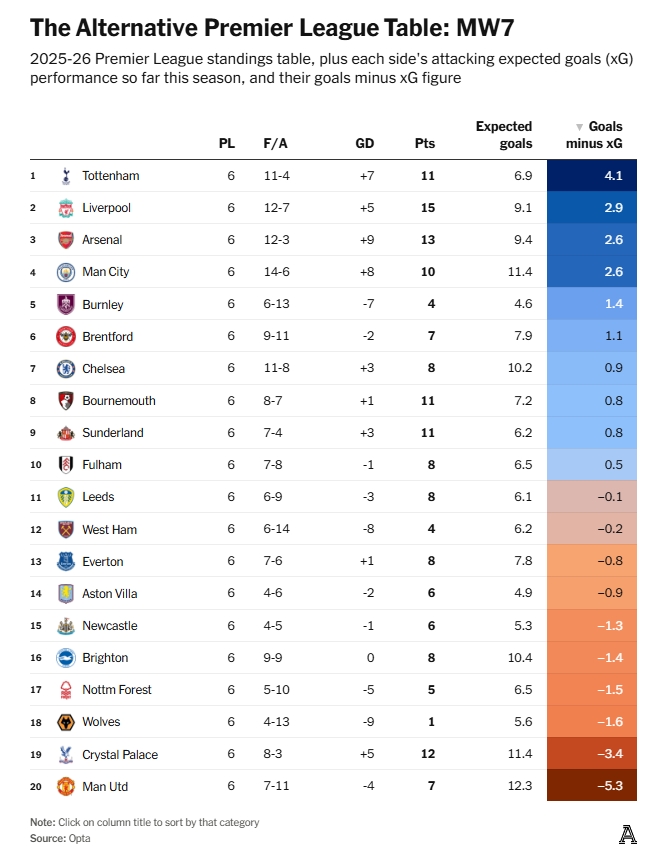 在本赛季英超预期进球值与试验进球值榜单中,热刺是推崇最佳的,他们试验进球比预期进球多4.1个,利物浦(2.9个)、阿森纳(2.6个)、曼城(2.6个)分居二至四位。