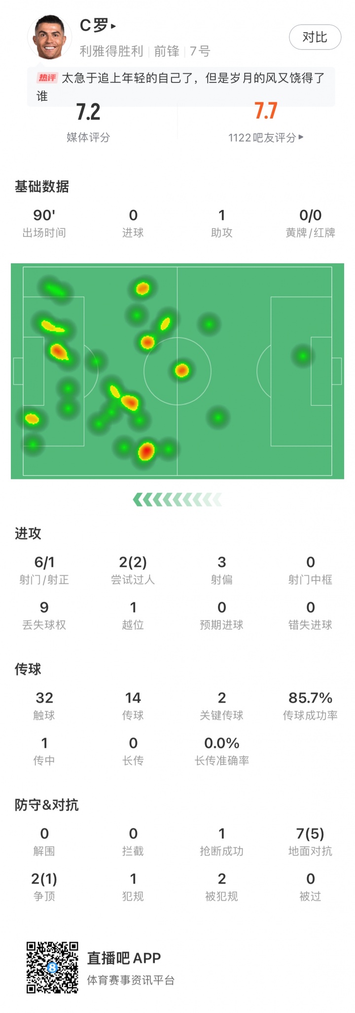 C罗本场比赛首发出战90分钟,孝顺一次助攻。