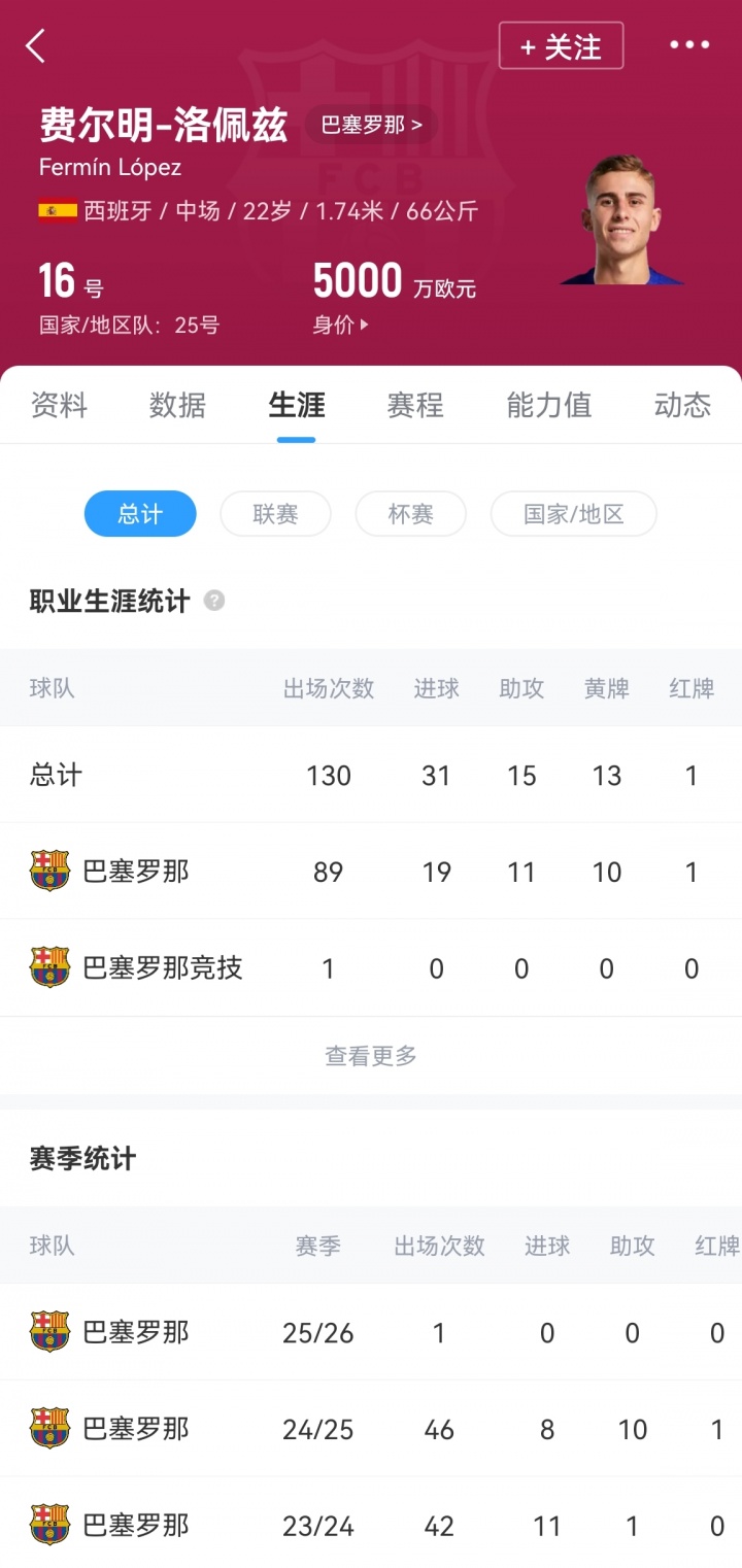 22岁的费尔明出自巴萨青训,收尾现在共为巴萨一线队出场89次,打入19球11助攻,他的德回身价为5000万欧元。