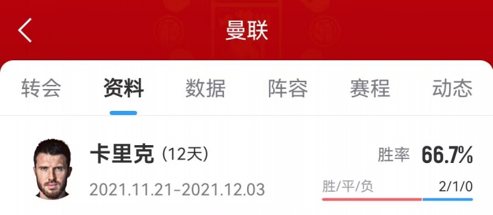 曼联2021年解老板帅索尔斯克亚后,卡里克曾一刹担任曼联的临时主帅。他带队的3场比赛保捏不败,包括在欧冠中礼服黄潜,以及联赛中礼服阿森纳。