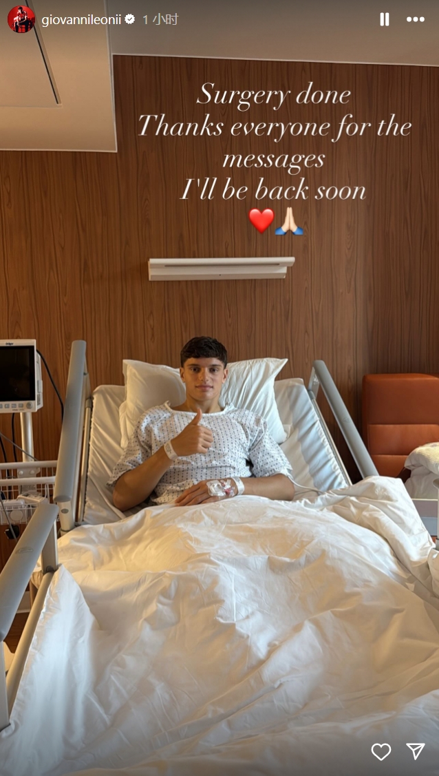 莱奥尼晒出在病床上的像片,配文:“手术完成,感谢环球的祝愿信息,我会很快回首。”