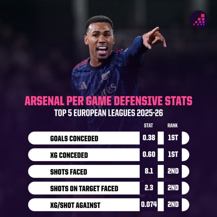 数据统计浮现,阿森纳本赛季5项驻扎端关键数据均位列英超前二: