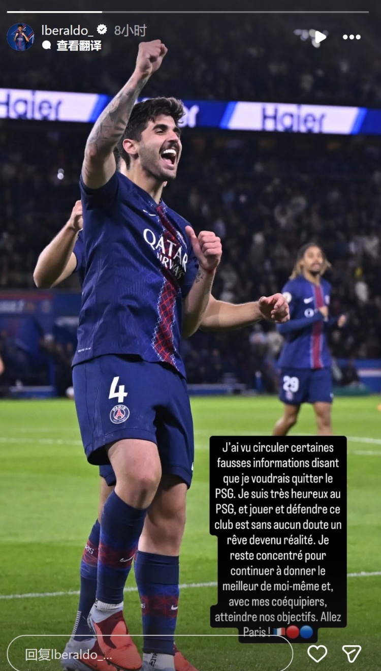 11月1日讯 巴黎后卫贝拉尔多更新社媒动态,辟谣离队传奇。