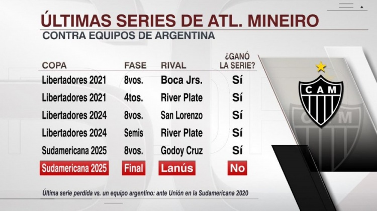 米内罗竞技2021年以来对阵阿根廷球队获得5连胜,打败博卡、河床(2次)、圣洛伦索和戈多伊克鲁斯,但此役连胜被拉努斯完了。