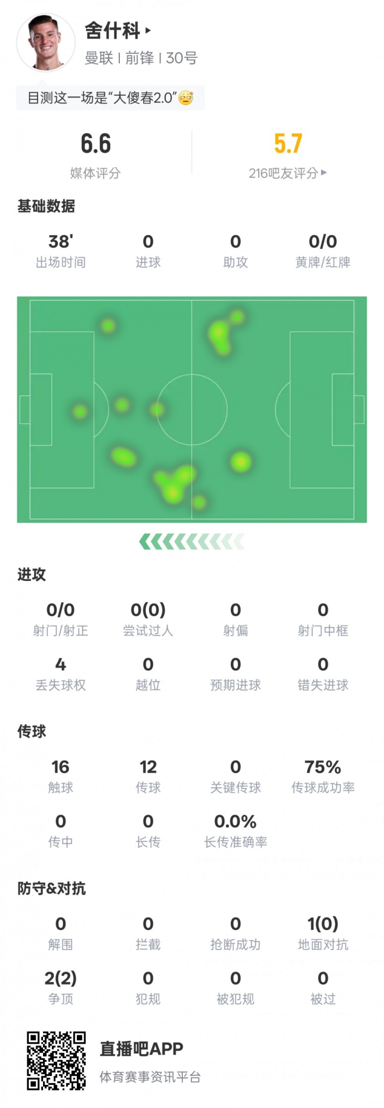 8月25日讯 2025-26赛季英超第2轮,曼联客场1-1富勒姆。舍什科替补出战,多项数据挂零,唯有2次争顶均得胜。
