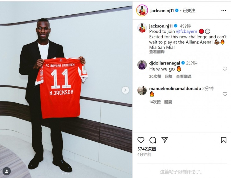 杰克逊晒起初拿拜仁11号球衣的相片,并写谈:“很自重能加盟拜仁,对这个新挑战感到得意,迫不足待思要在安联球场踢球了!Mia San Mia!!”