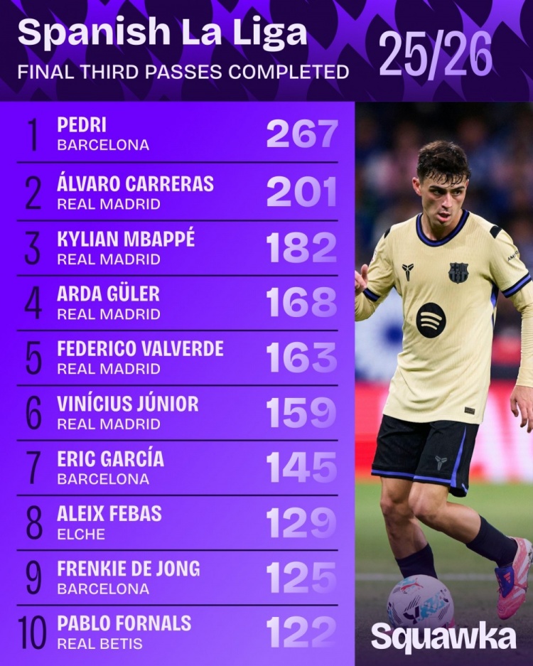 10月7日讯 日前,Squawka统计了本赛季西甲进攻三区传球次数名次,佩德里267次居首,5名皇马球员进前十。