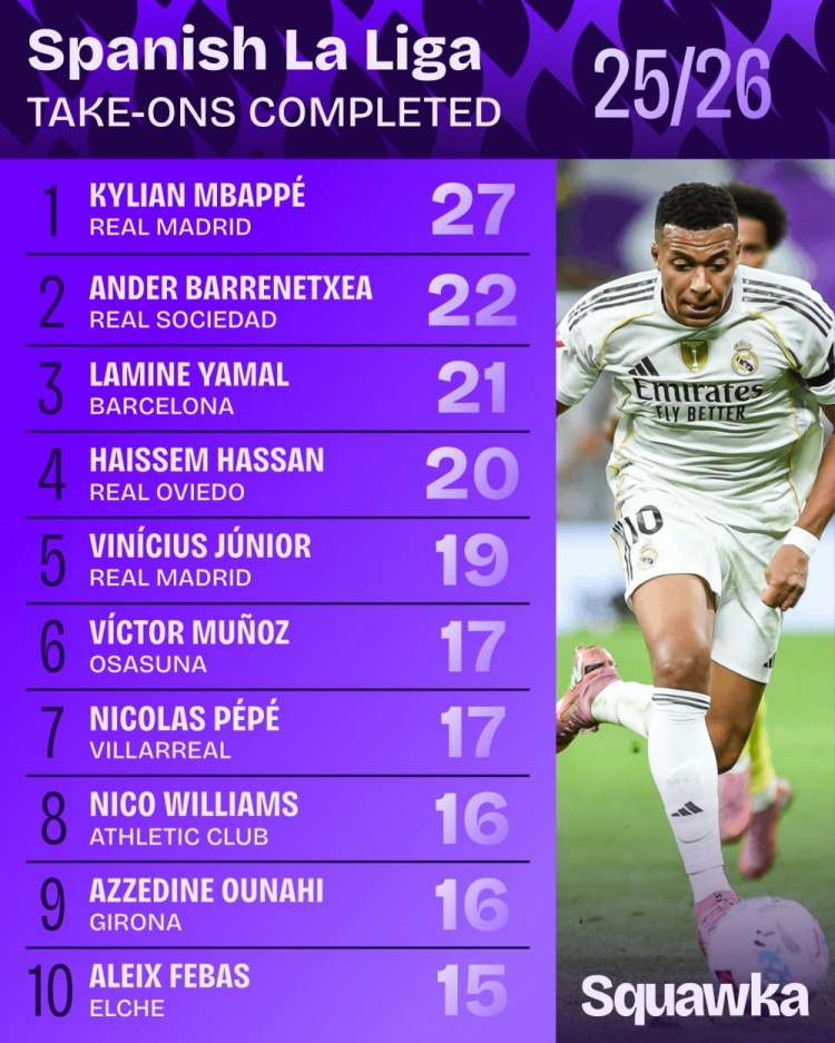 10月7日讯 日前,Squawka统计了本赛季西甲过东谈主次数排名,姆巴佩以27次过东谈主居首。