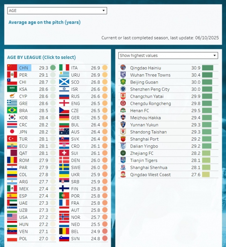 据CIES统计,在大家50个主流联赛中,中超的平均年事为29.3岁,仍为大家最高,比第二的秘鲁联赛朝上0.2岁。