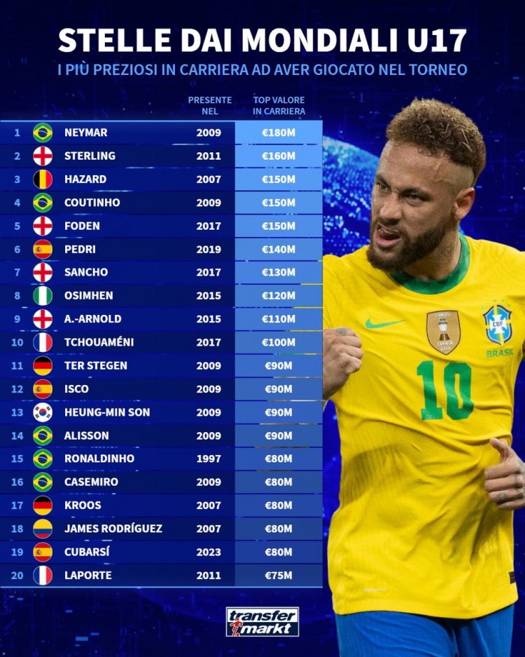 11月15日讯 德转列出了曾投入U17天下杯球员最高身价排行,内马尔1.8亿欧居首,斯特林1.6亿欧次席。