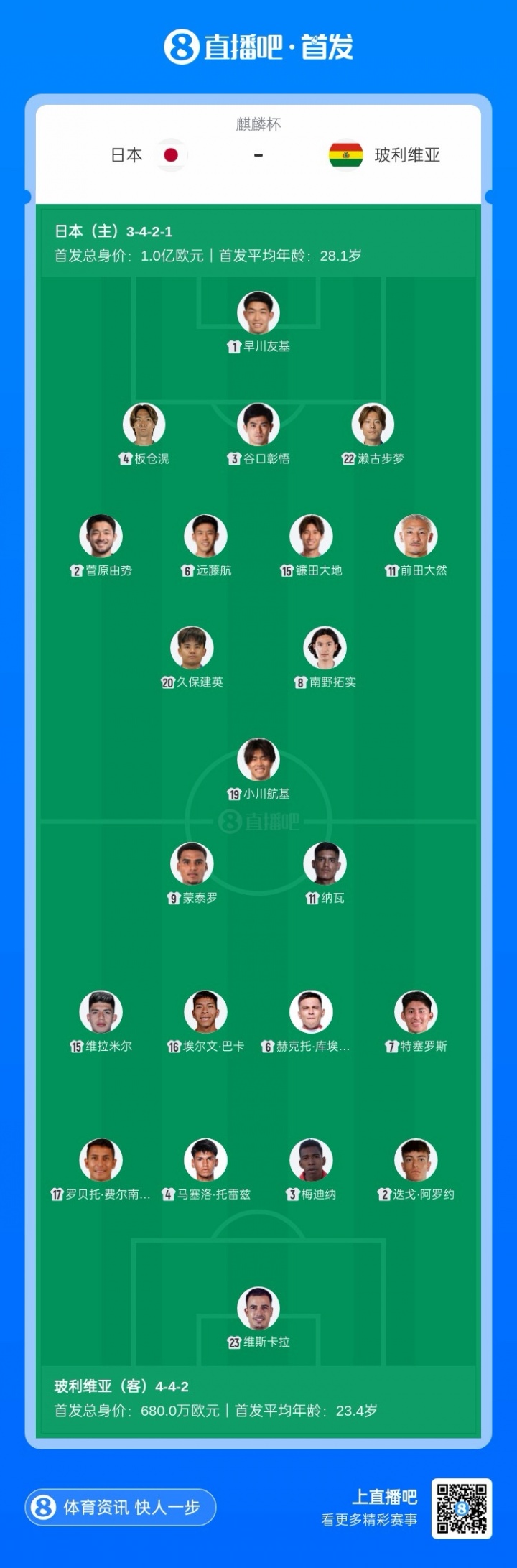 11月18日讯 18点15分麒麟杯,日本在友谊赛对阵玻利维亚。