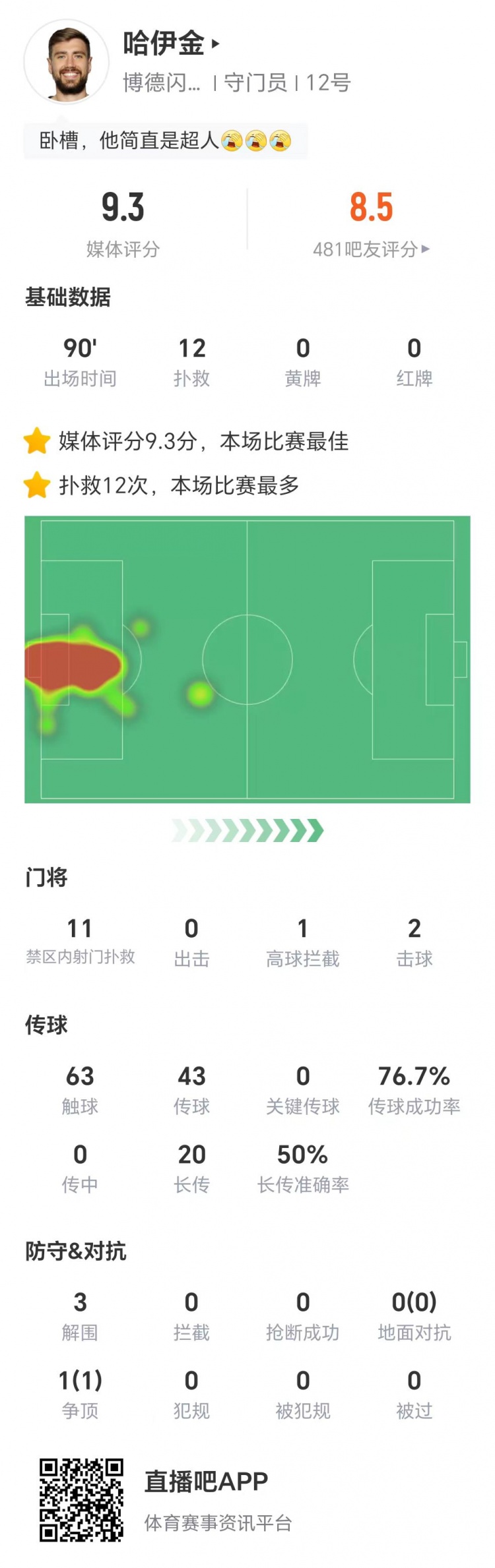 赛后工夫统计数据流露,哈伊金本场比赛共有12次扑救,其中11次齐是濒临尤文禁区内的射门。另外,他还有3次突围。