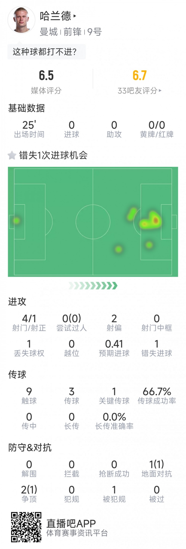 11月26日讯 在本轮欧冠曼城0-2不敌勒沃库森的比赛中,哈兰德替补登场,以下为他在本场数据:
