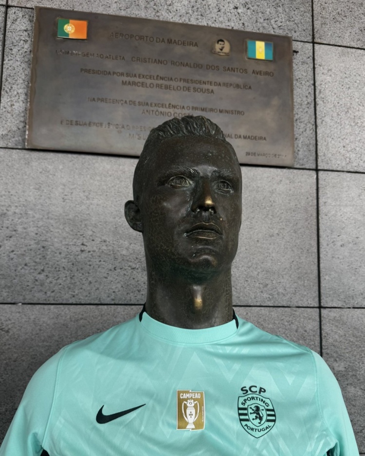 葡萄牙体育社媒晒出C罗在马德拉国外机场(又称C罗机场)的雕像相片,雕像身穿葡萄牙体育新赛季球衣。