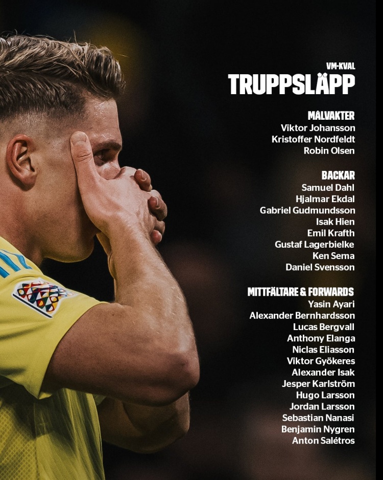 中前场:亚辛-阿亚里(布莱顿)、伯恩哈德森(基尔)、贝里瓦尔(热刺)、伊兰加(纽卡)、埃利亚松(雅典AEK)、约克雷斯(阿森纳)、伊萨克(纽卡)、卡尔斯特罗姆(乌迪内斯)、雨果-拉尔森(法兰克福)、乔丹-拉尔森(哥本哈根)、纳纳西(斯特拉斯堡)、本杰明-尼格伦(凯尔特东说念主)、萨莱特罗斯(AIK索尔纳)