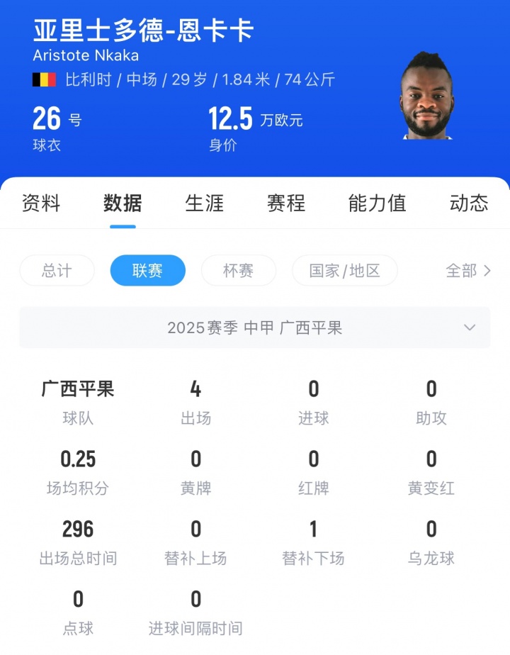 2025年4月13日下昼,2025华润饮料中国足球甲级联赛第4轮,广西平果国晶客场对阵深圳后生东谈主。比赛进行到第22分钟时,尼卡卡回追突围并在与敌手拼抢经由中倒地,立时因伤无法坚合手比赛,被动替换下场。后经医疗组检察和病院会诊阐明,尼卡卡左脚跟腱断裂,将缺席本赛季剩余统统比赛。