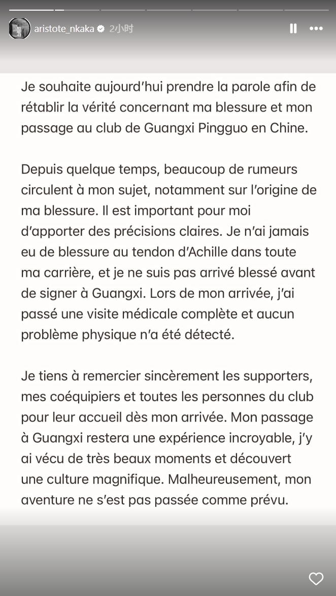 最近几周出现了好多对于我的传言,尤其是对于我伤病根源的说法。我以为有必要讲明施行情况:在我的通盘事业糊口中,从未遭受过跟腱挫伤,与广西队签约时也并非带伤抵达。抵达俱乐部后我接收了全面体检,其时并未检出任何健康问题。