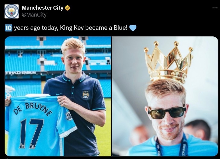 8月30日讯 在十年前的今天,德布劳内与曼城签约,开启了光芒的曼城糊口,曼城官推也晒出球员初到曼城时的青涩相片,配文写谈:“10年前的今天,国王凯文成为蓝月军团一员。”