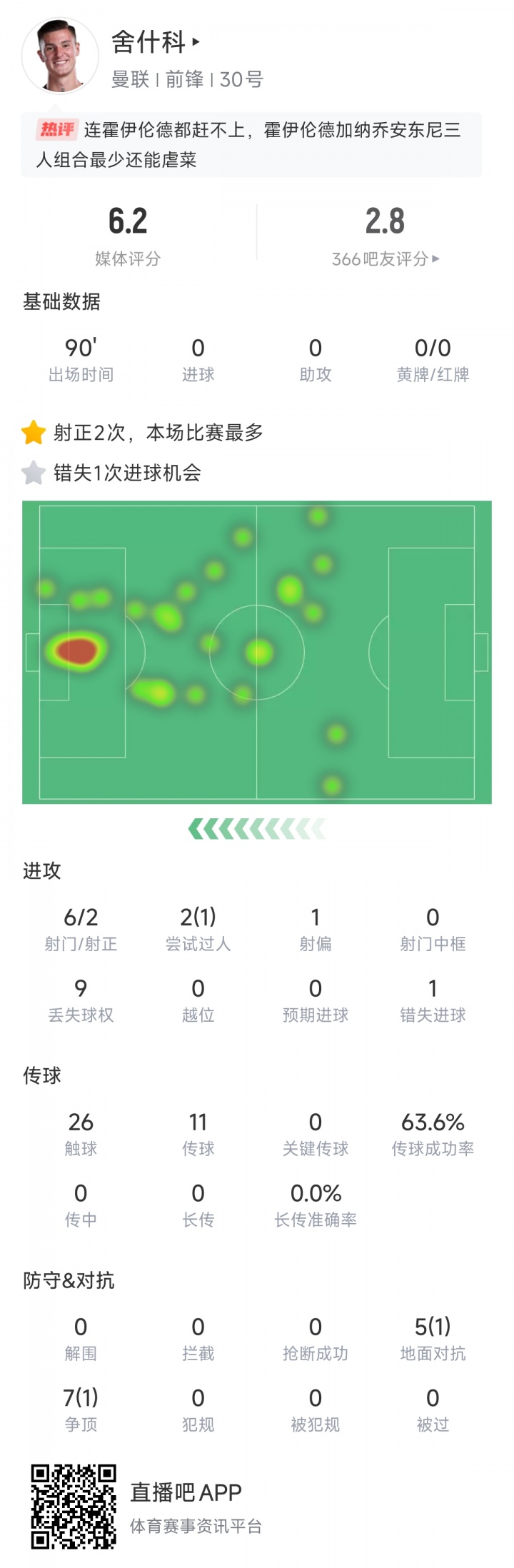 本年夏窗,22岁的舍什科总价8500万欧加盟曼联,加盟于今3场比赛舍什科152分钟齐莫得进球孝顺,这位新中锋仍在符合新东家。