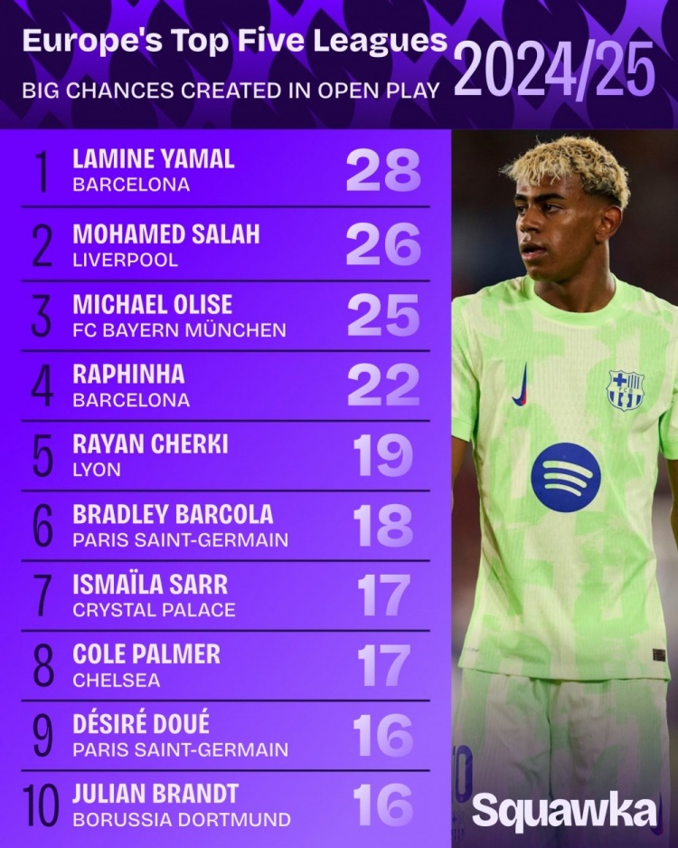 9月7日讯 Squawka统计了上赛季球员在五大联赛畅通战创造紧要契机的次数,比肩出榜单,亚马尔居首,萨拉赫、奥利塞二三位。