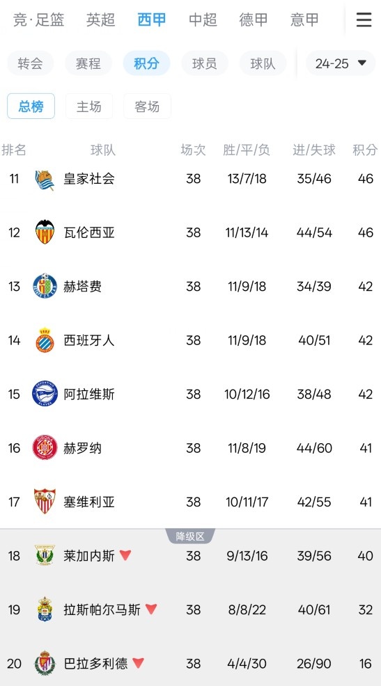塞维利亚24-25赛季积分榜位置↓