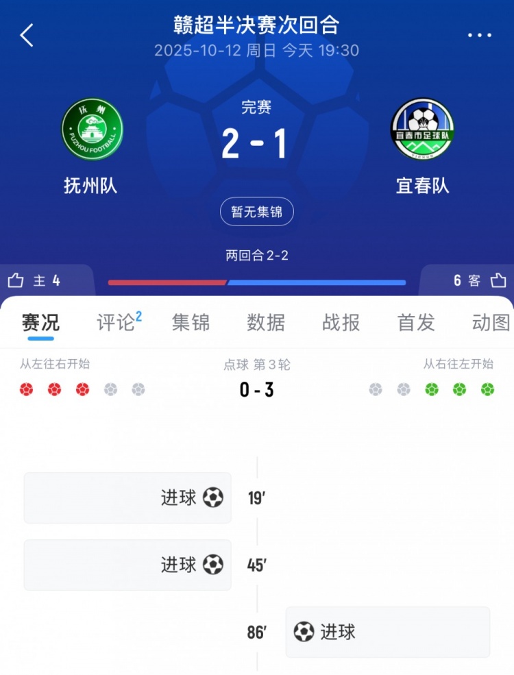由于首回合客场0-1不敌宜春队,抚州队凭债主场之利握住发起攻势,并在第19分钟赢得前场纵情球契机,23号球员饶晨主罚径直破门,匡助抚州队主场1-0逾越;第40分钟抚州队再次专揽定位球完成破门,饶晨左侧角球开出,混战中28号章豪将球顶进对方球门,助抚州队2-0逾越。半场为止抚州队总比分2-1逾越。
