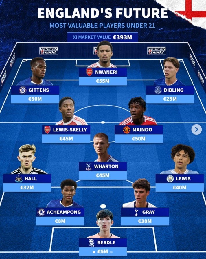 10月12日讯 德转列出英格兰U21最贵威望,恩瓦内里突前,斯凯利、梅努、吉滕斯在列,全队总身价3.93亿欧。