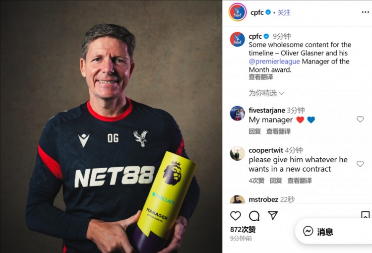 10月14日讯 水晶宫官方晒照,主训导格拉斯纳领取9月份英超最好训导奖项。