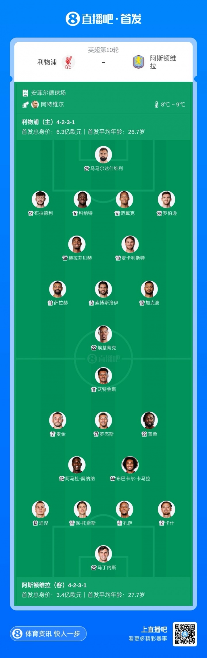 利物浦首发:25-马马尔达什维利、4-范戴克、5-科纳特、12-布拉德利、26-罗伯逊、8-索博斯洛伊、10-麦卡利斯特、38-赫拉芬贝赫、11-萨拉赫、18-加克波、22-埃基蒂克