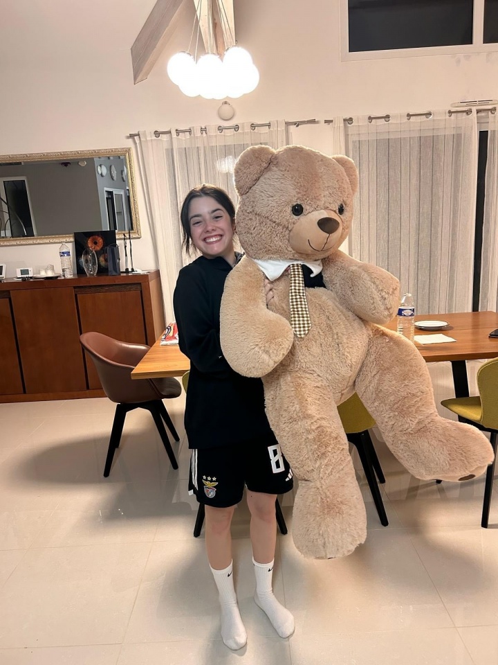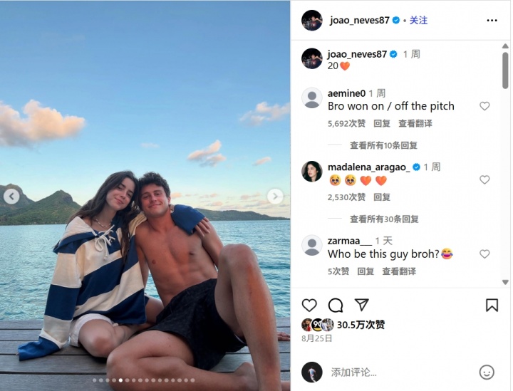 巴黎中场若奥-内维斯在社媒晒照,为女友马达莱娜庆祝她的20岁诞辰,女友也在讨论区与其互动。